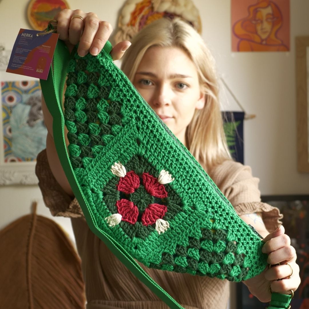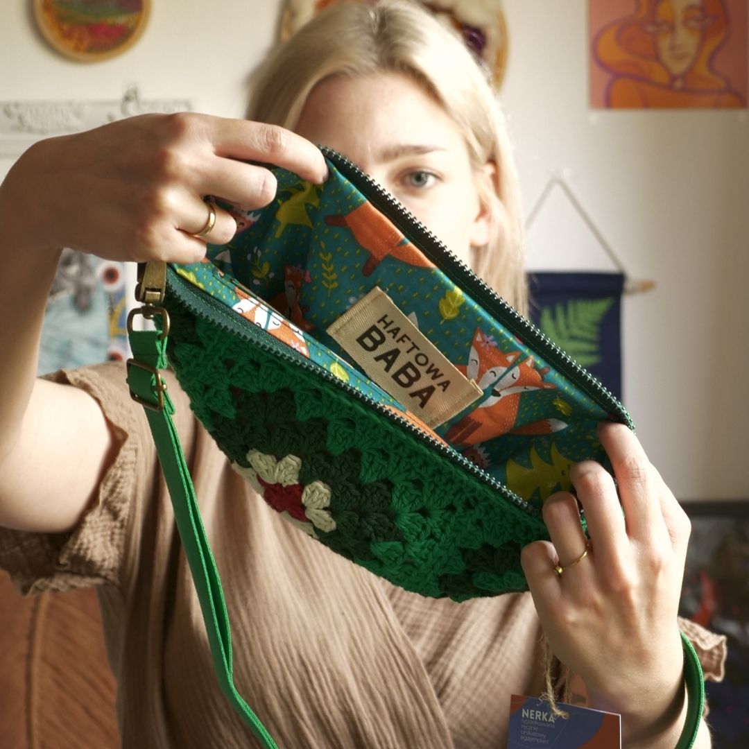 Ta wyjątkowa nerka została wykonana ręcznie z certyfikowanej przędzy 100% bawełnianej, co gwarantuje naturalność, trwałość i komfort użytkowania. Podszewka powstała z ekologicznej tkaniny z drugiego obiegu, a metalowe elementy, zamki oraz taśmy są produkcji polskiej, co podkreśla wysoką jakość i dbałość o detale.