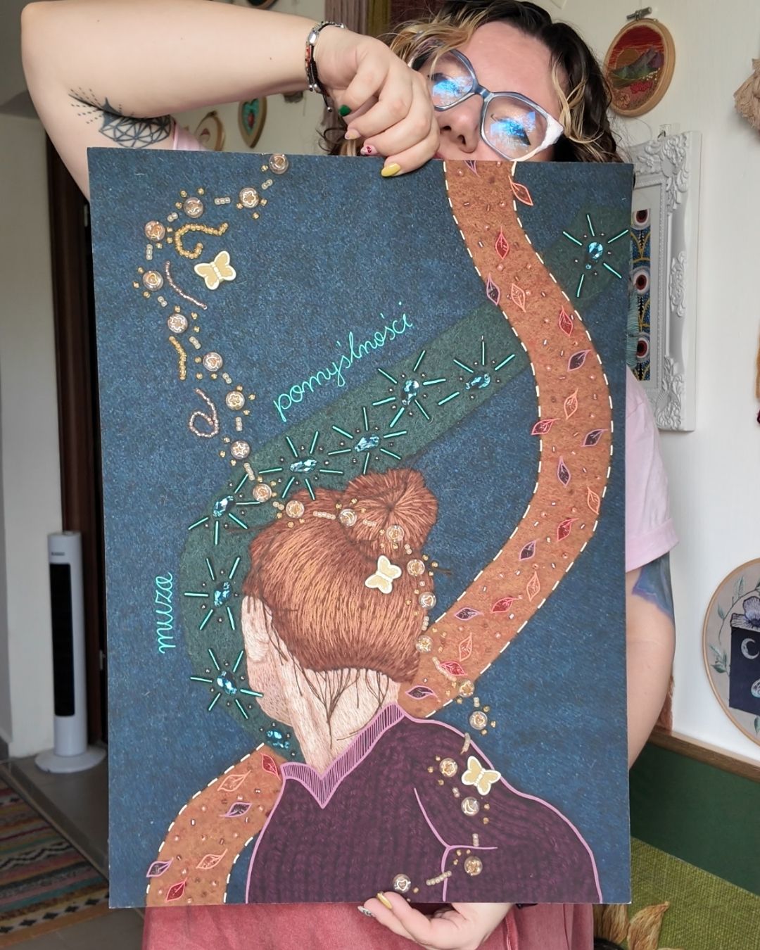 Technika: haft ręczny (cieniowany, realistyczny + wstążkowy) → fotografia → druk artystyczny