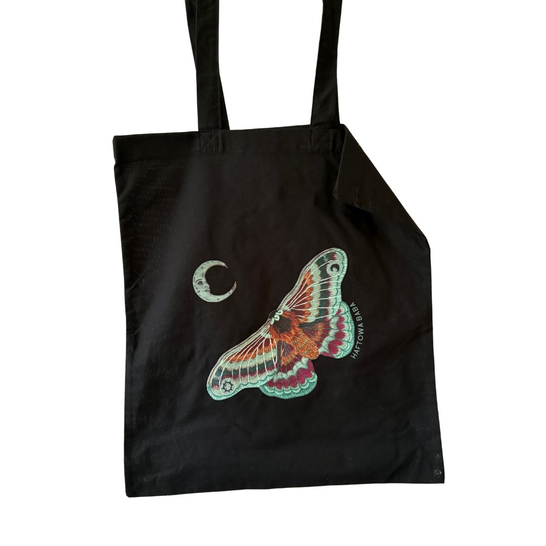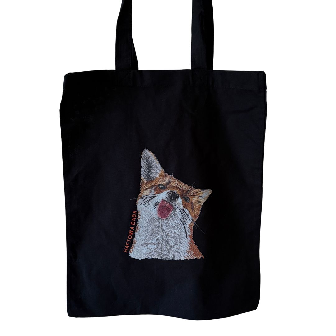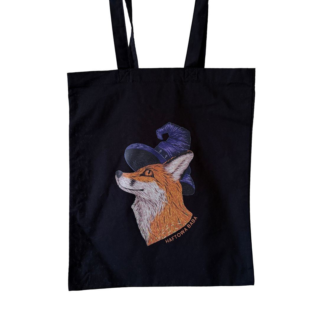Czarna torba bawełniana z wyjątkowym nadrukiem przedstawiającym lisa w czarodziejskim kapeluszu. Autorski projekt powstał na podstawie ręcznego haftu, dzięki czemu wyróżnia się oryginalnością i artystycznym charakterem. To funkcjonalny dodatek i zarazem ekologiczna alternatywa dla jednorazowych toreb.