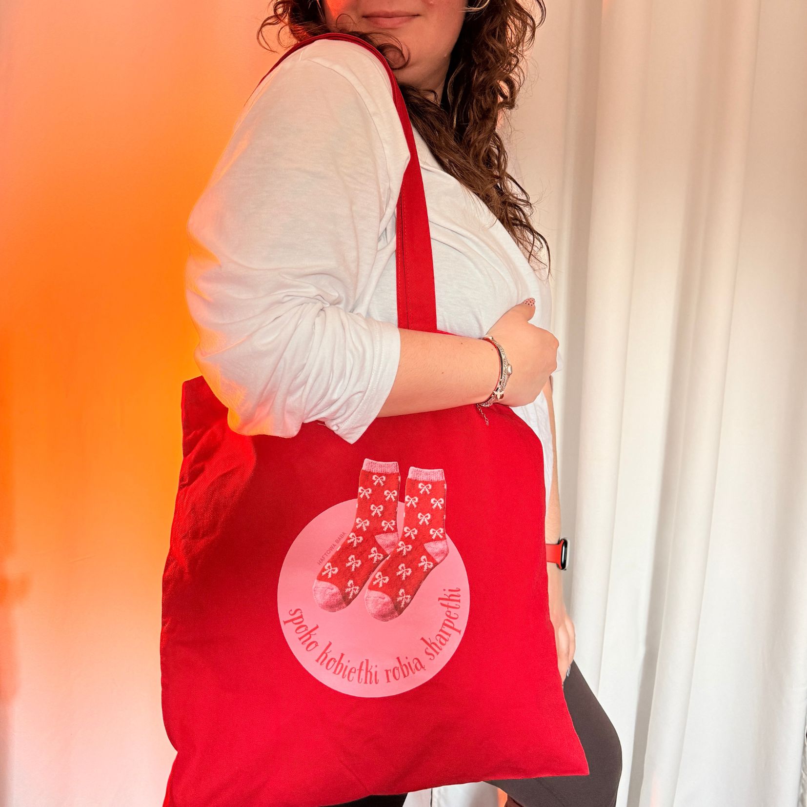 Ta intensywnie czerwona torba to mały manifest rękodzielniczej dumy. Powstała z myślą o osobach, które wiedzą, że motki włóczki, rozpoczęty projekt i „jeszcze jeden rządek” można zabrać wszędzie.